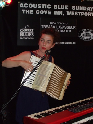 Singer/songwriter and multi-instrmentalist TREASA LEVASSEUR - the "slim chicken" with the BIG voice - delivered an incredible show to close out the ACOUSTIC BLUE SUNDAY Summer Series at THE COVE INN in Westport last Sunday. Not every act that plays here gets a standing ovation. She did. Her performance was more like a "happening" than a show - she had the audience in the palm of her hand all night. To quote regular attendee Dick Christy who posted this on Facebook: "Treasa Levasseur's performance at the final concert of this season's Acoustic Blue Monday Series at The Cove in Westport was as riveting as it was intimate. Fronting a trio which included David Gavan Baxter (guitars, mandolin) and Brian Kobayakawa (acoustic and electric basses), Treasa's used her primary instrument, her voice, as well as her solid keyboard playing to create a mood that allowed laughter, tears, and critical thought to co-exist. If this sounds excessive, ya weren' there!" |
